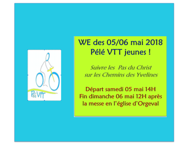 Une belle proposition de pèlerinage en VTT proposée pour les jeunes de 15 à 22 ans! Guillaume et Marie-Céline ont préparé cette sortie méticuleusement pour offrir un beau cocktail mélangeant sport, spiritualité le tout dans une ambiance qui s’annonce très joyeuse. Au programme: – départ le samedi 5 Mai à 14h de l’église d’Orgeval –…